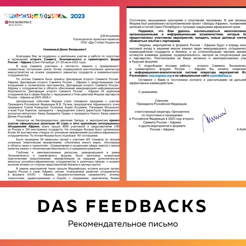 Спешим с вами поделиться благодарственным письмом: “… Глубокие и заинтересованные дискуссии, развернувшиеся в рамках Экономического и гуманитарного форума, были наполнены конкретными практическими предложениями, направленными на придание дополнительного импульса российско-африканскому сотрудничеству в различных сферах… “.